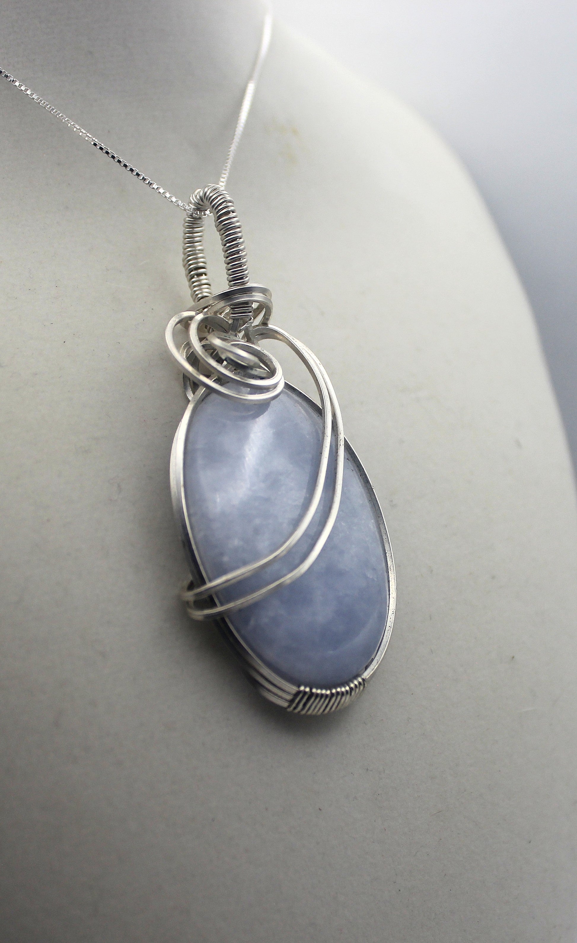 This handcrafted necklace features a polished Angelite cabochon wrapped in bright, tarnish-resistant Argentium Silver. Angelite is known for its deeply calming energy, supporting emotional peace, gentle communication, and higher-realm connection. Often associated with serenity, compassion, and spiritual guidance, it’s a stone beloved for soothing the mind and opening the throat and crown chakras. Each swirl of silver is shaped by hand, creating an elegant design that highlights the stone’s soft, ethereal blue tone. Suspended from a sterling silver chain, this one-of-a-kind piece offers both beauty and a sense of calm, centered clarity.