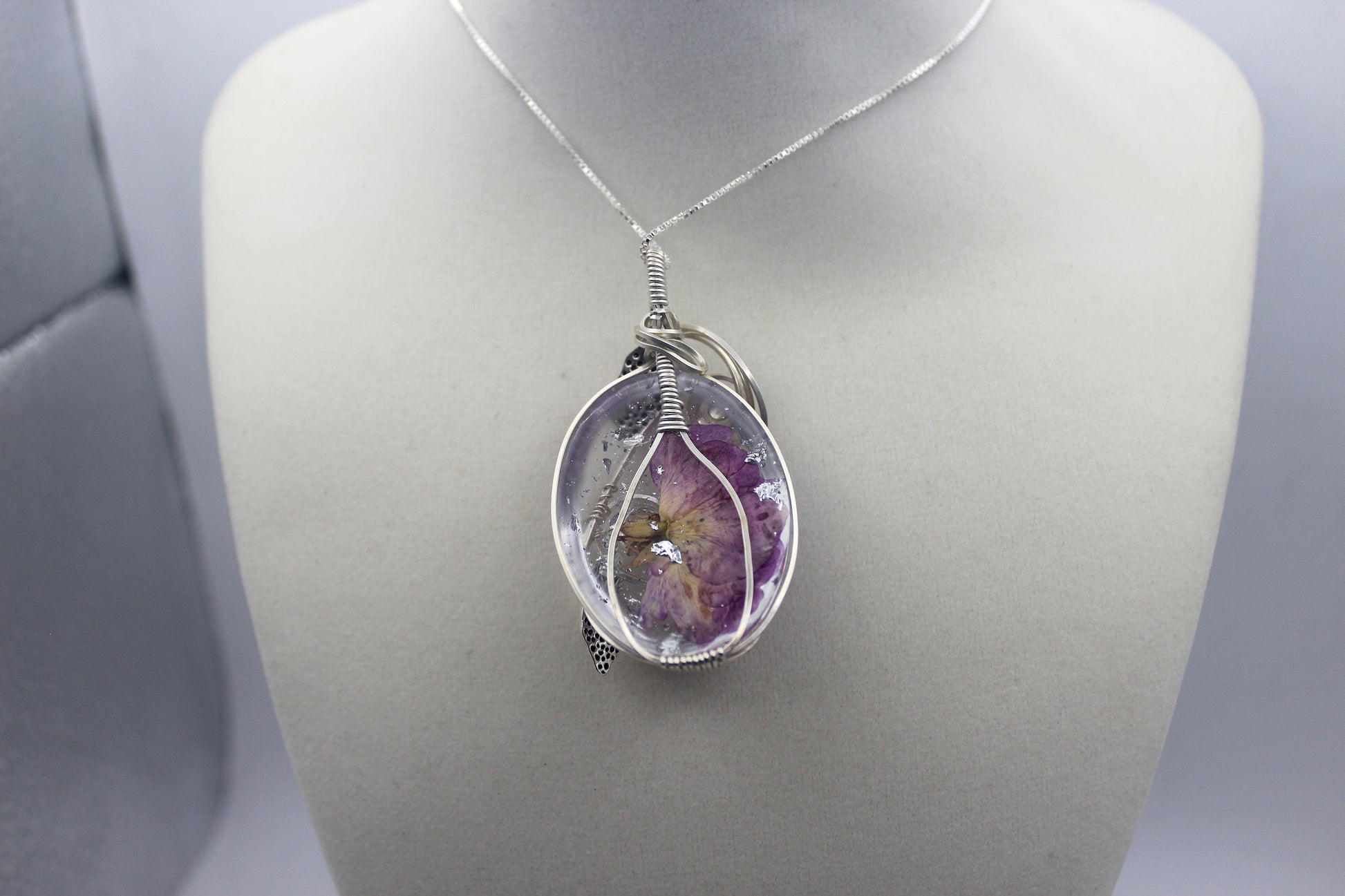 Argentium Silver Resin Purple Dried Flower Pendant Necklace