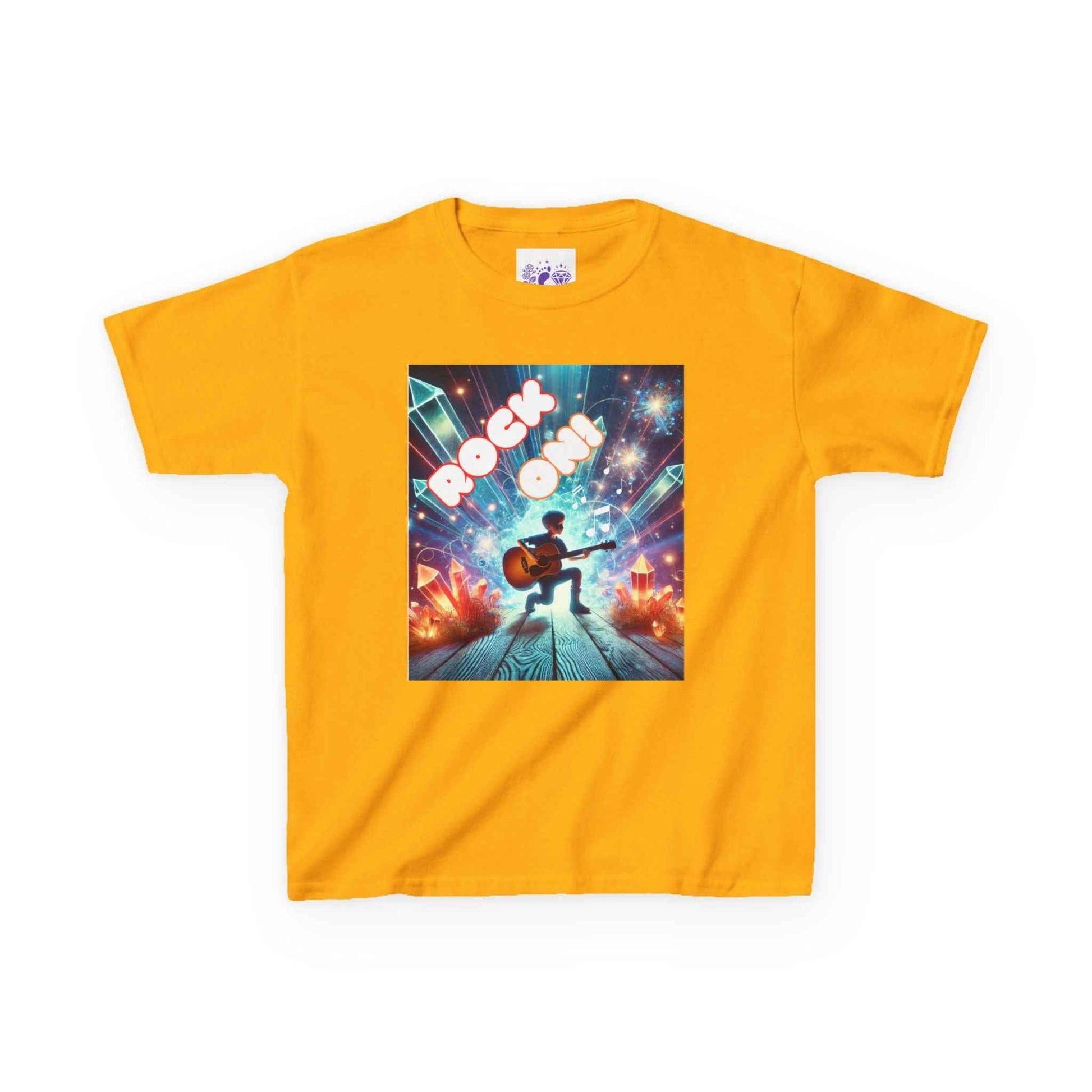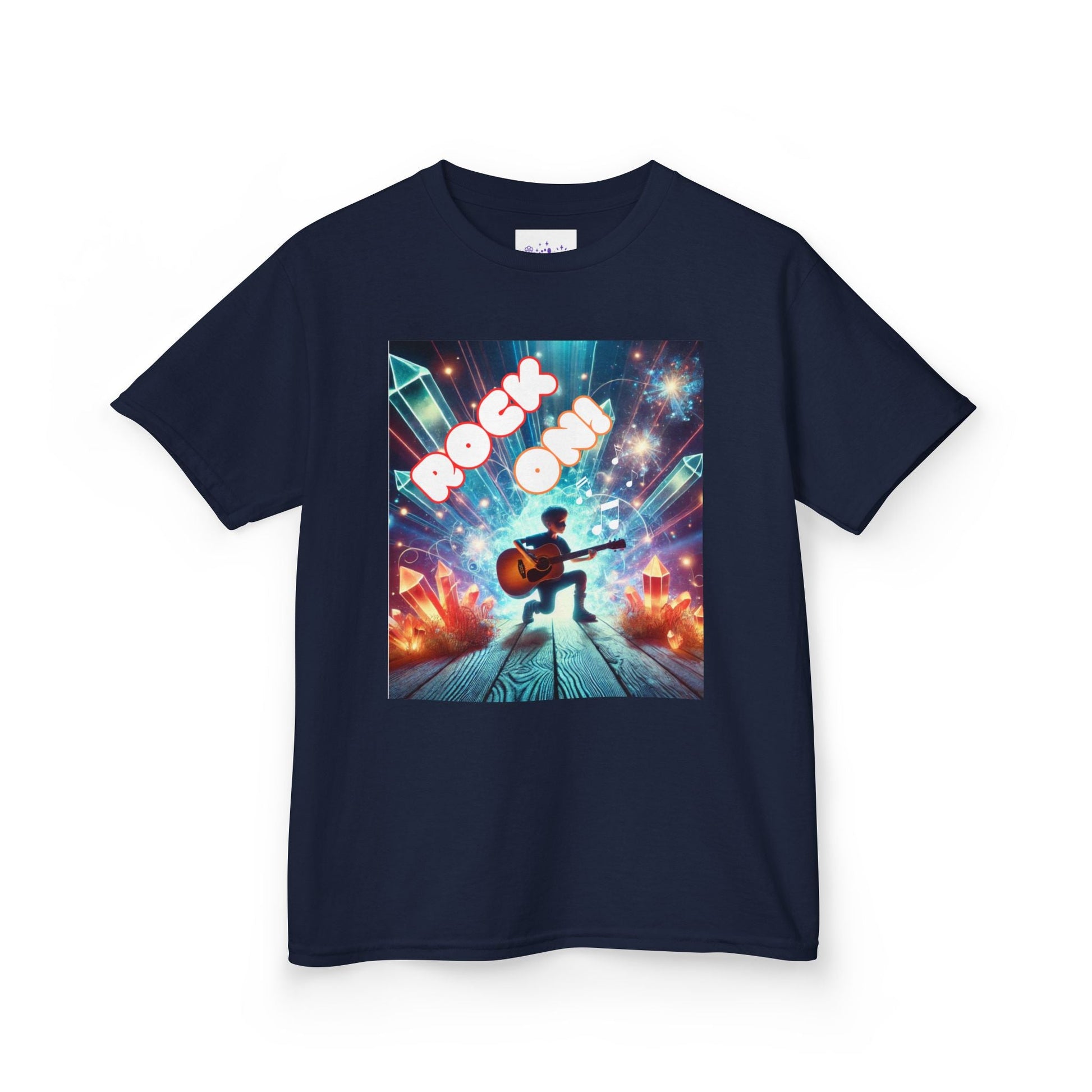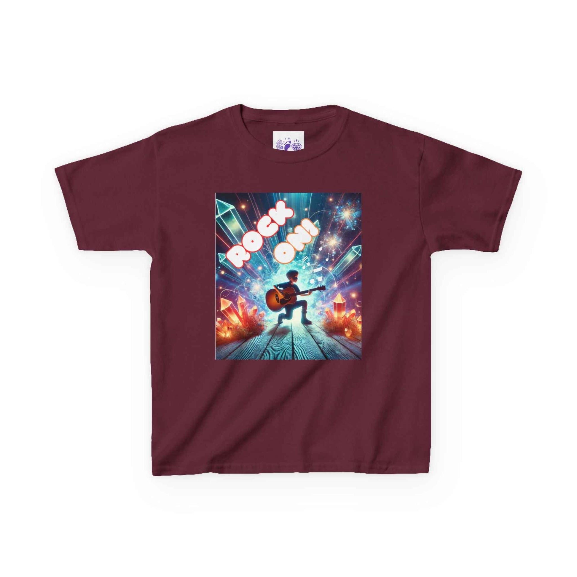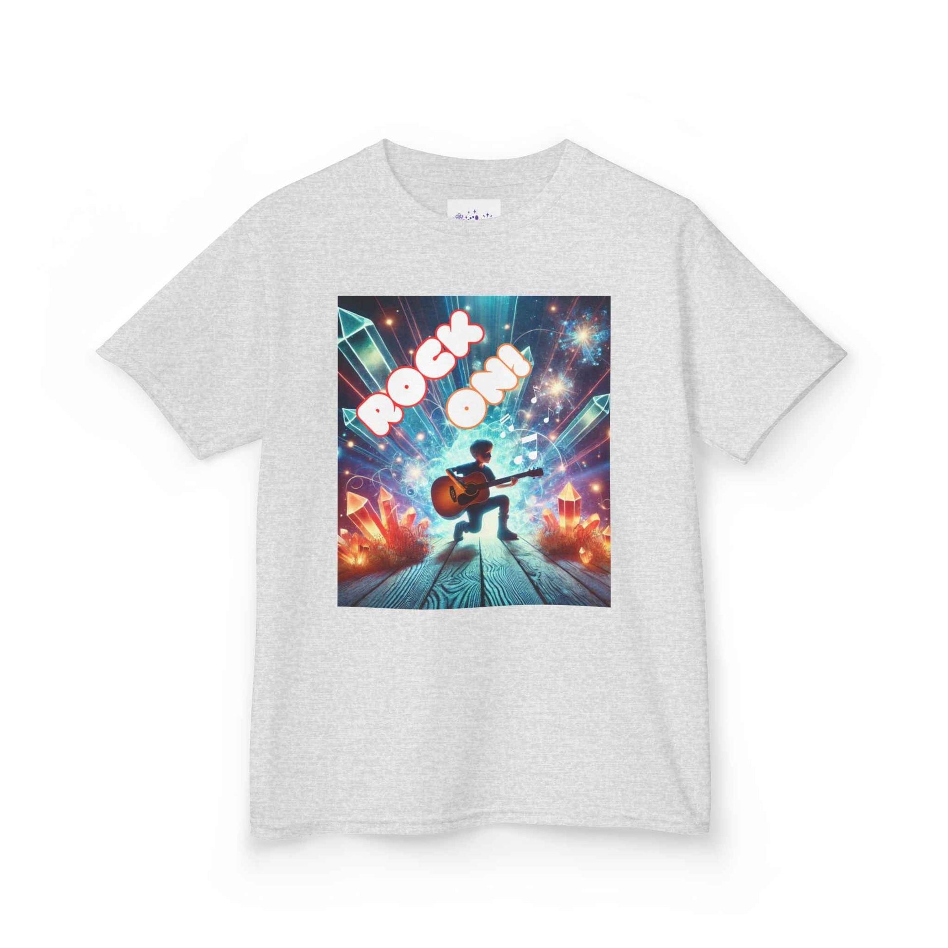 Let your little rockstar shine with our brand-new 'ROCK ON' Kids' Shirt! This fun and magical tee features a cool kid rocking out on a guitar, surrounded by vibrant crystals, making it the ultimate fusion of music and magic.