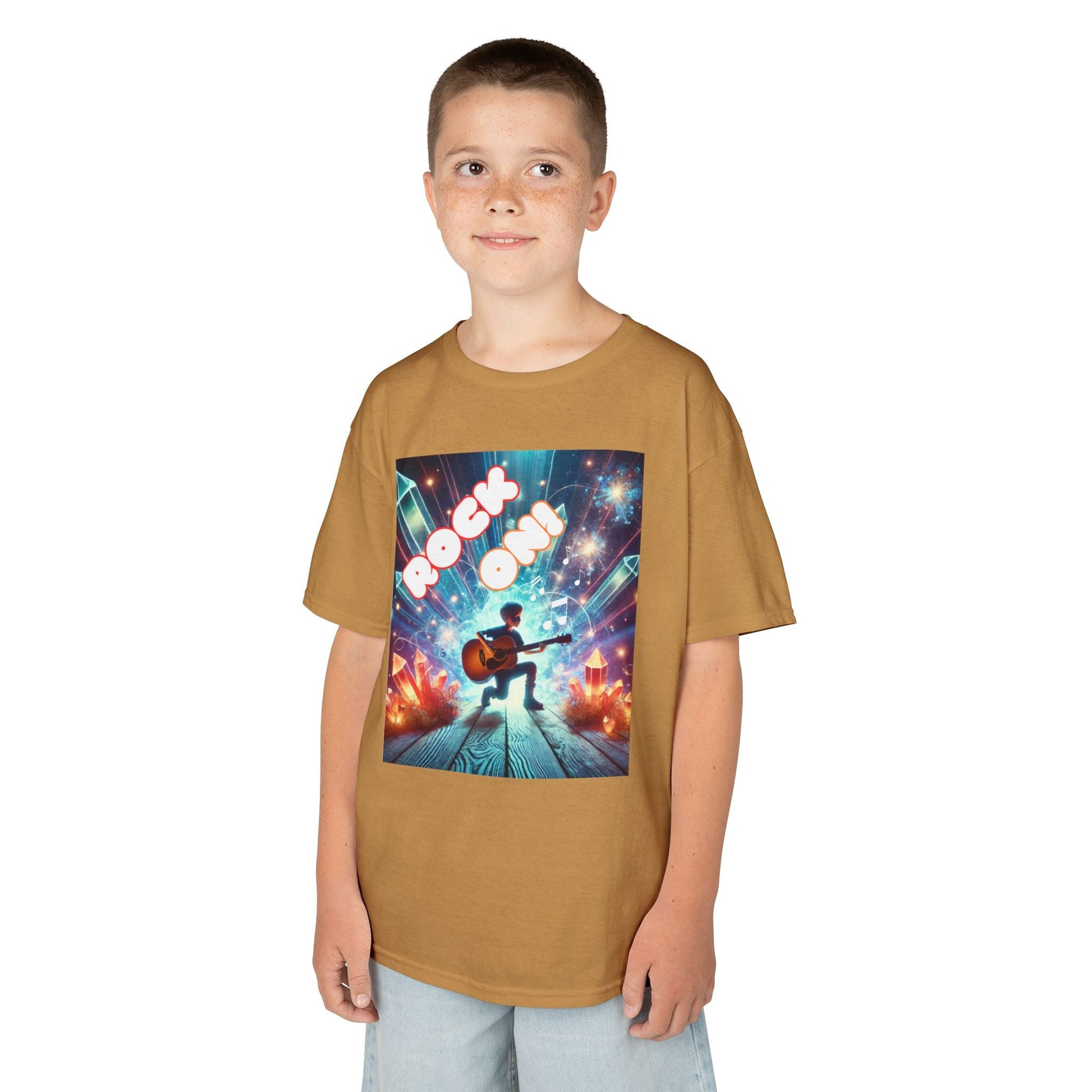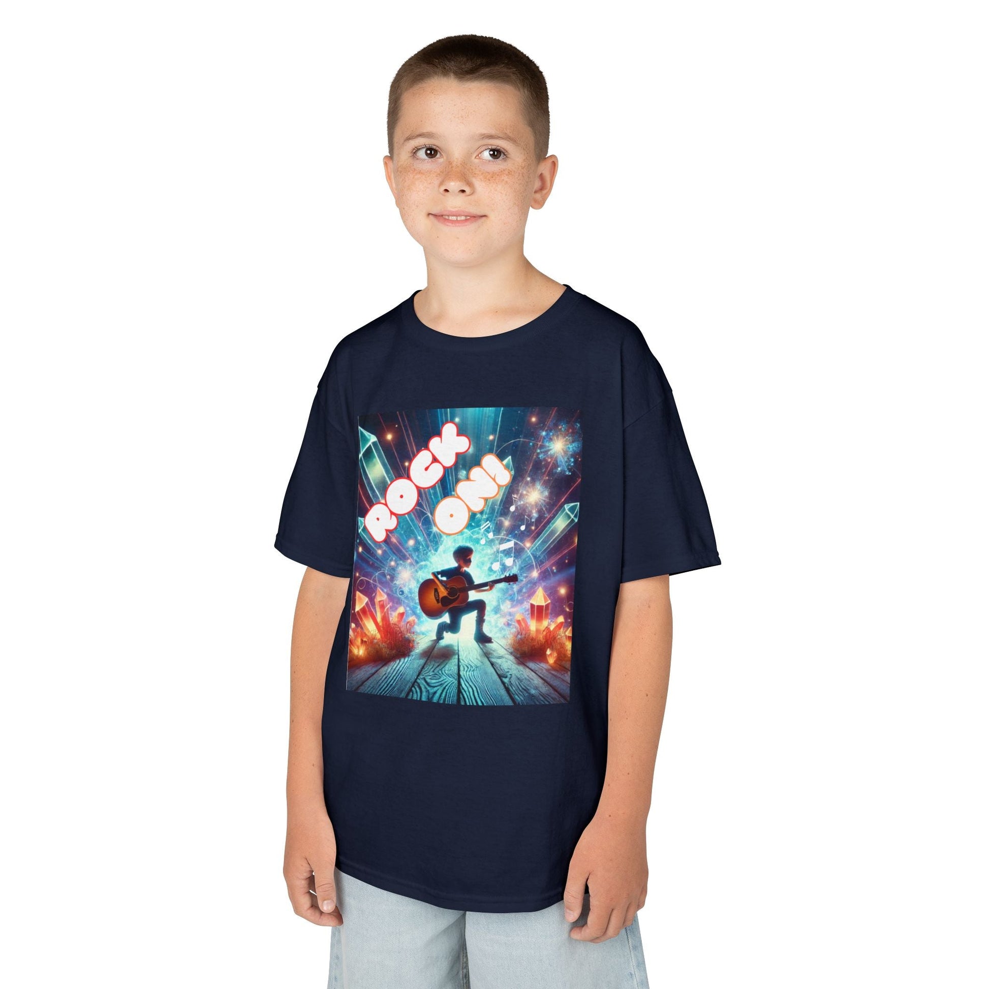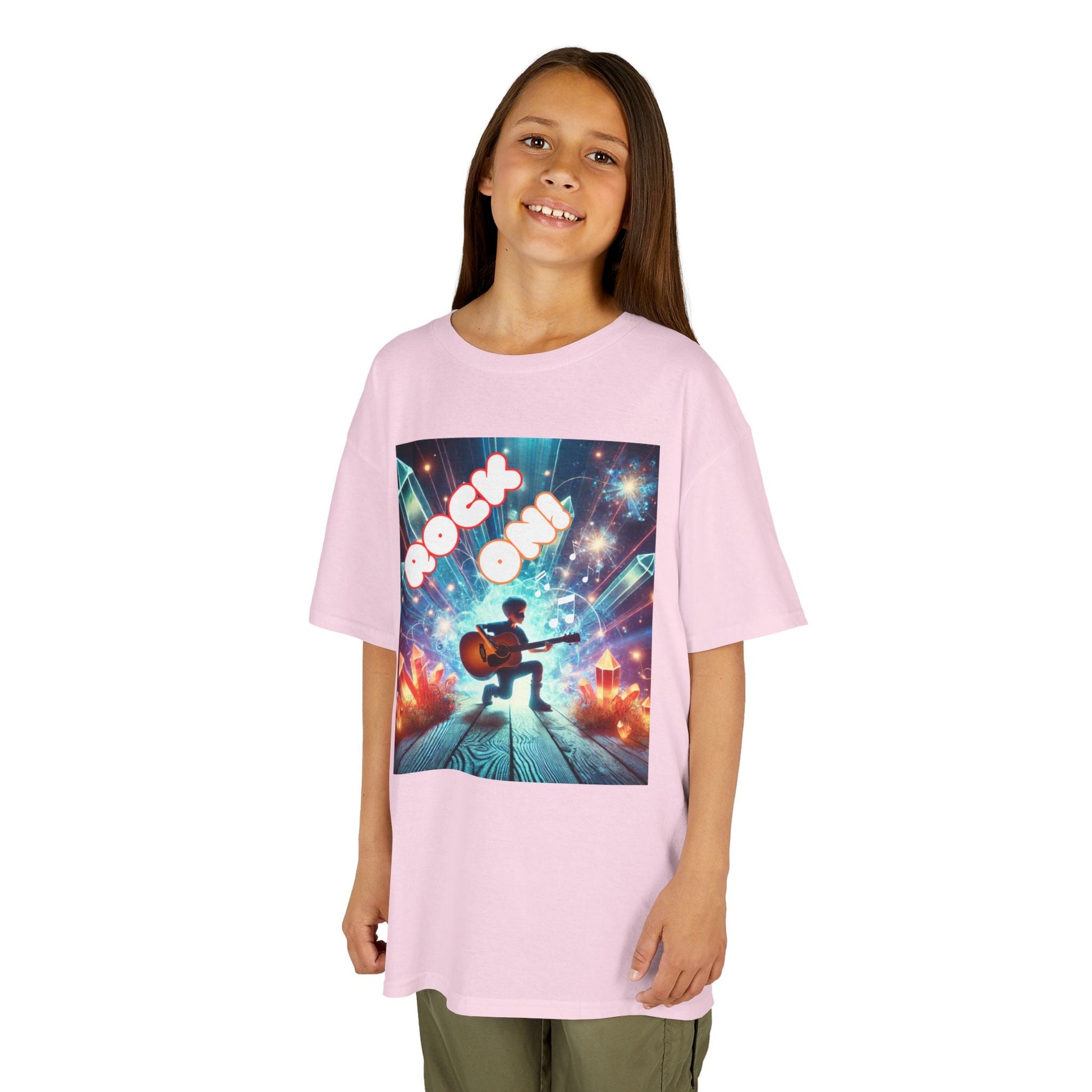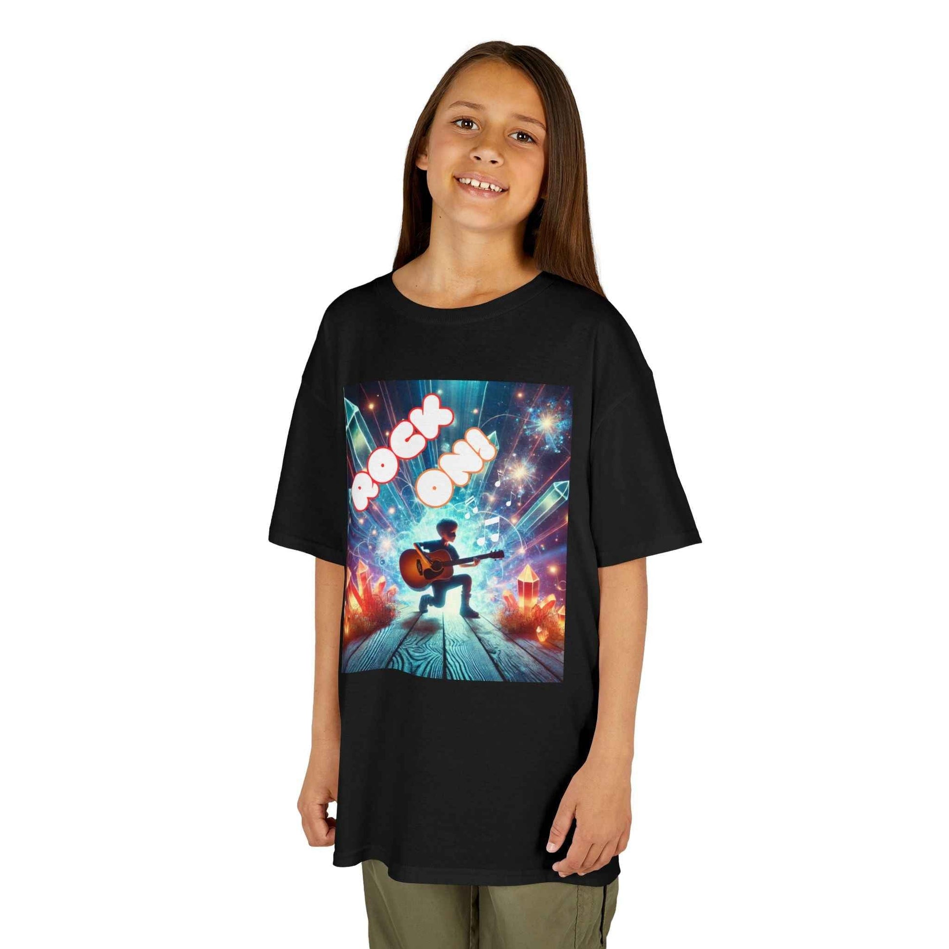 Let your little rockstar shine with our brand-new 'ROCK ON' Kids' Shirt! This fun and magical tee features a cool kid rocking out on a guitar, surrounded by vibrant crystals, making it the ultimate fusion of music and magic.
