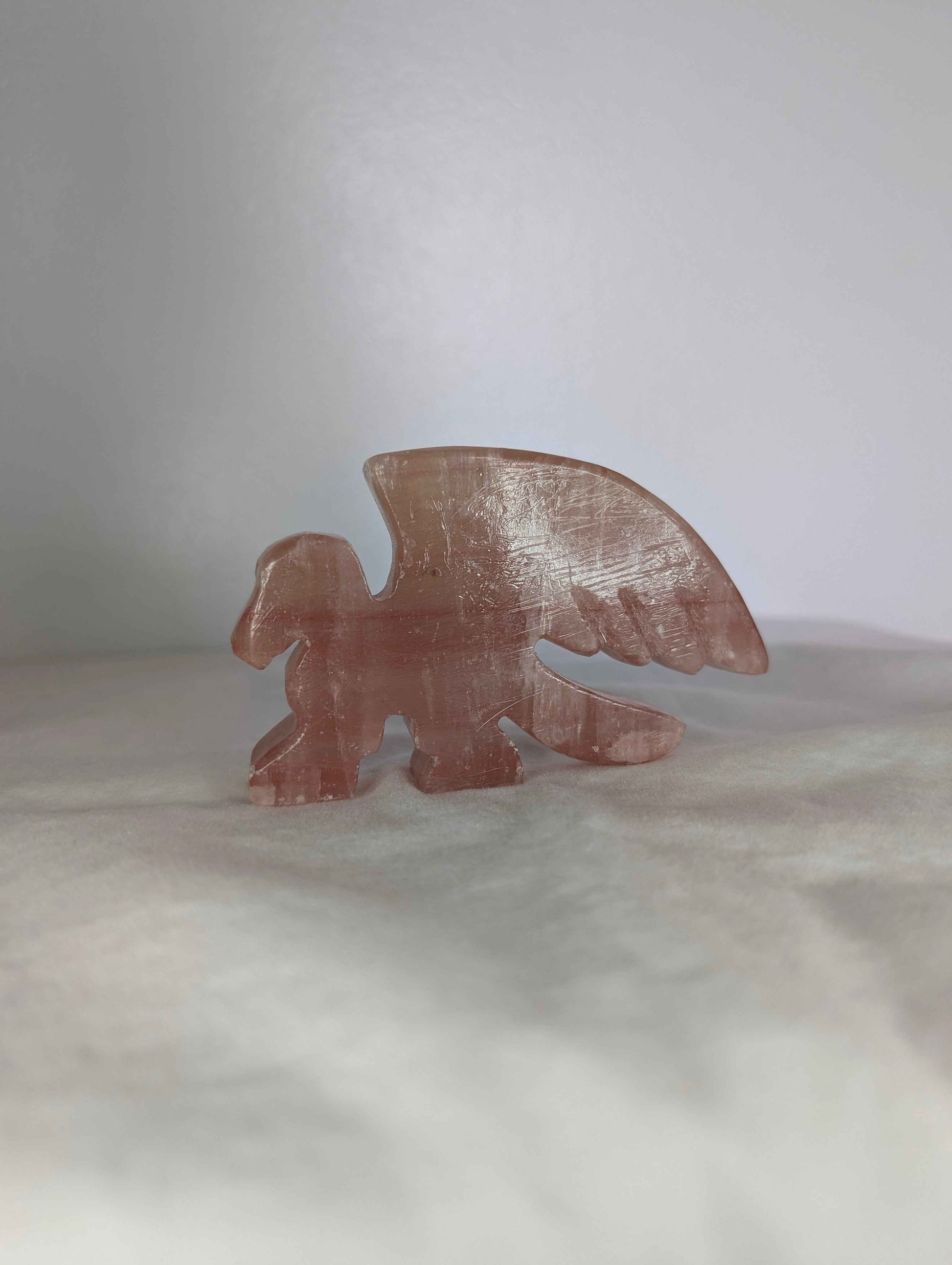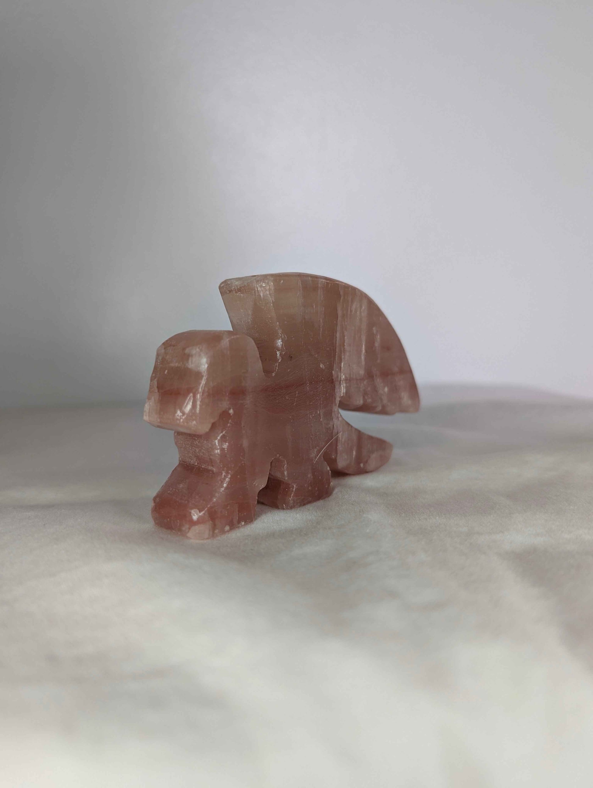 A guardian of heart and spirit, this 4" Mangano Calcite Griffin radiates gentle strength and ethereal grace. Carved from the soft pink glow of Mangano Calcite—known for its deep emotional healing, angelic connection, and heart chakra activation—this mythical creature blends fierce protection with nurturing love.