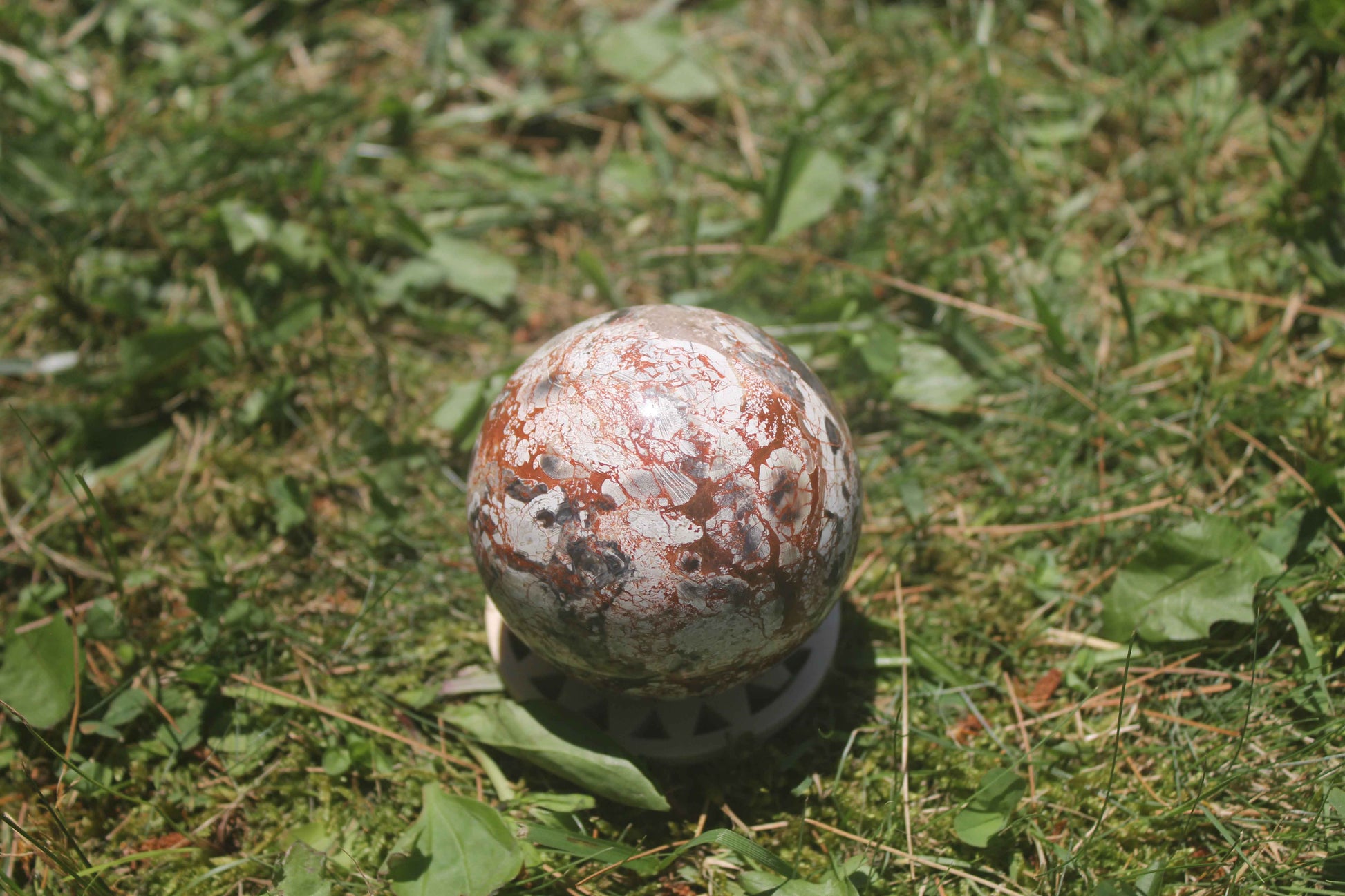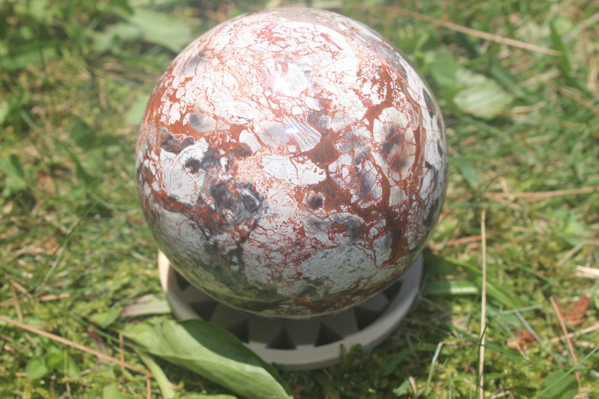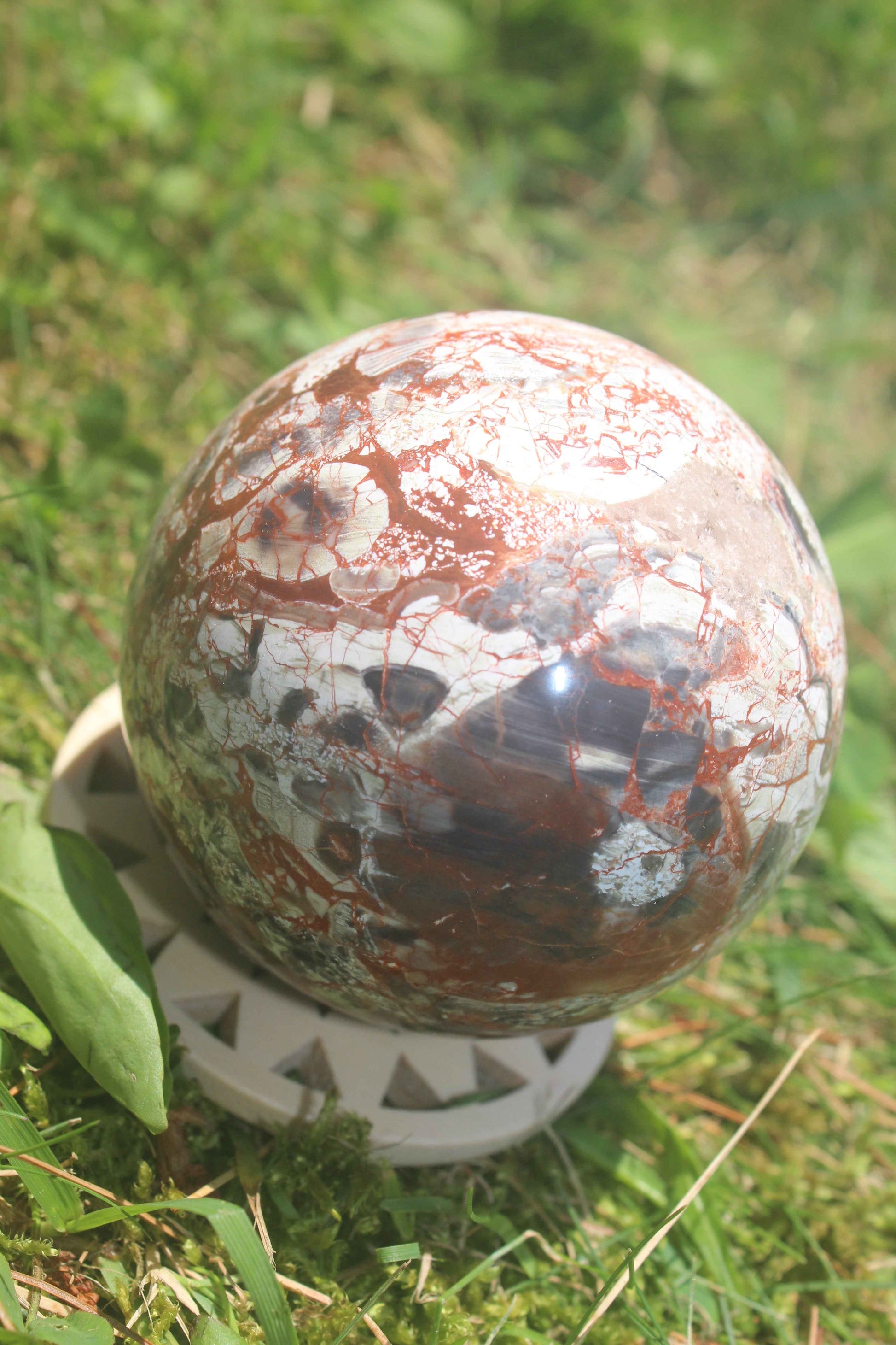 This mesmerizing Money Agate sphere is a natural work of art, covered in wild red veins and earthy patterns that resemble roots of abundance. With swirling tones of terracotta, ivory, gray, and onyx, this orb feels like holding a map of grounded wealth in your hands.