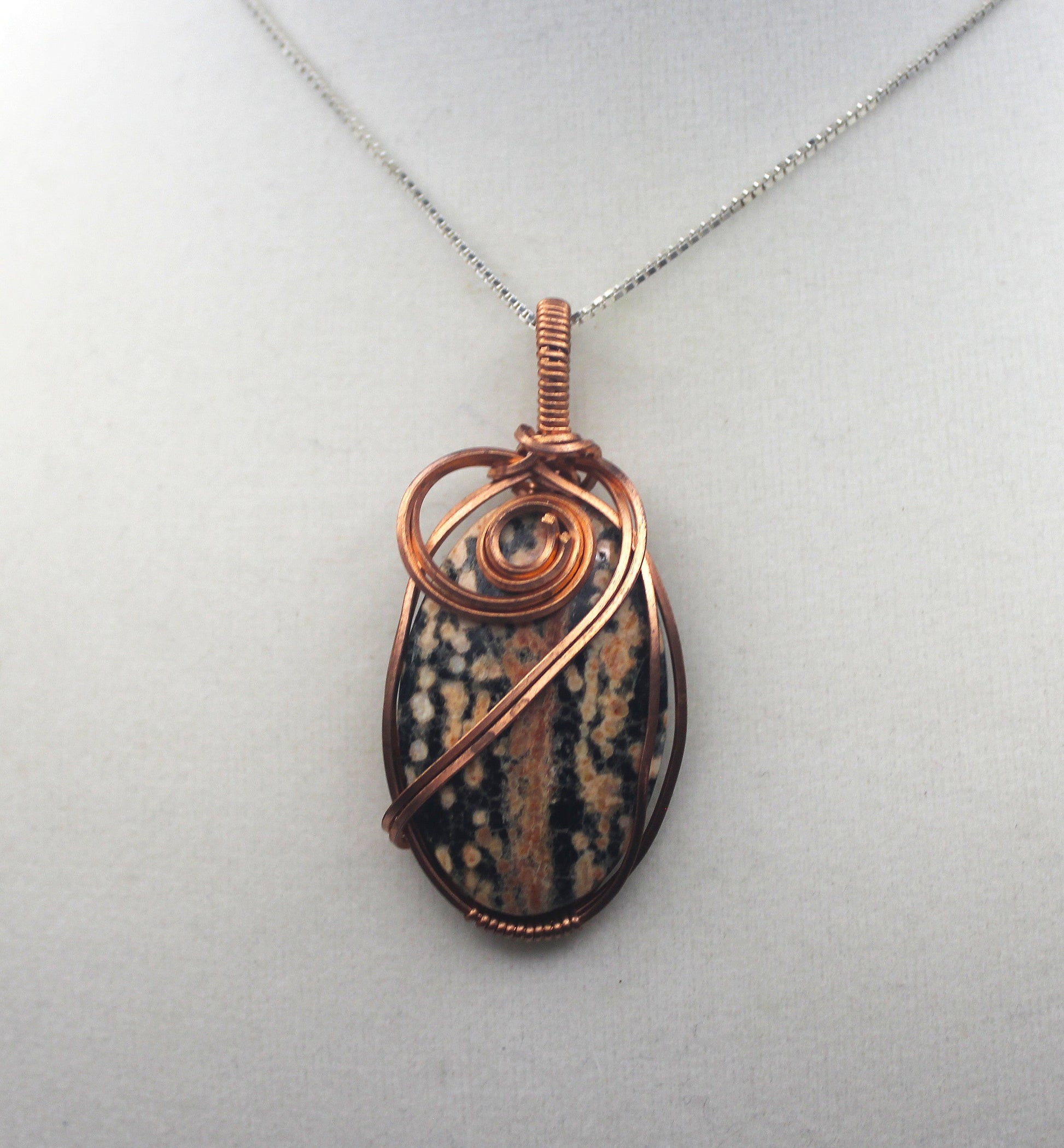This striking pendant features a natural Firework Obsidian cabochon wrapped in warm, raw copper. The stone displays its signature streaks and dotted bursts—patterns that look like tiny sparks frozen in time. The free-flowing copper spirals add movement and energy, making this piece feel alive and powerful.