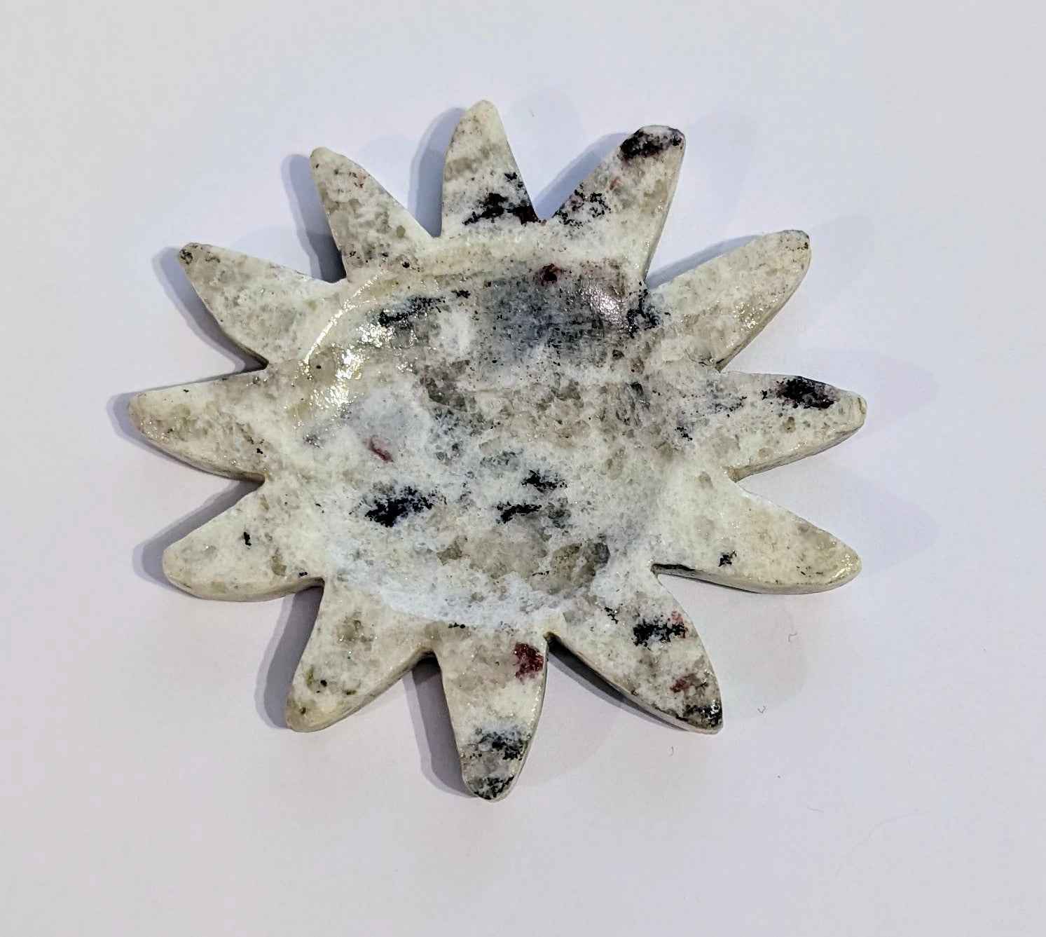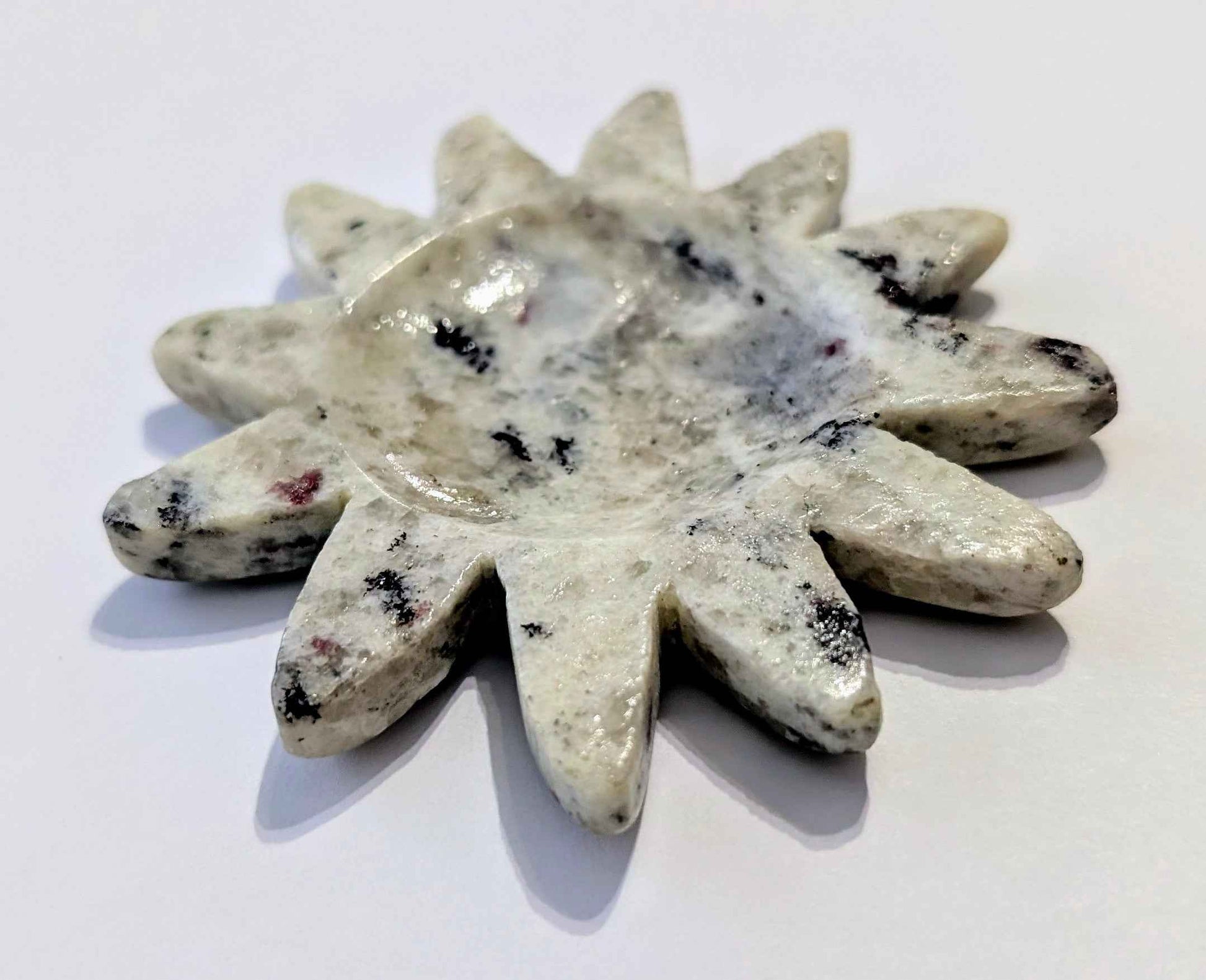 This radiant sun-shaped bowl is carved from a creamy white matrix stone scattered with striking inclusions of Rubellite Tourmaline—a rare pink variety known for its connection to the heart chakra, emotional healing, and unconditional love.